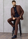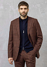 Мужской костюм коричневый в черную клетку из смеси: шерсти, конопли, шелка и кашемира. Шерсть — отвечает за терморегуляцию, конопля обладает антибактериальными свойствами, шелк — придаёт блеск, кашемир — добавляет мягкость. Ткань костюма от фабрики Fratelli Tallia di Delfino (итальянский производитель тканей класса люкс). Силуэт Milano (полуприталенный) обеспечивает умеренное прилегание к телу, делая фигуру визуально более стройной. Лацкан пиджака классический. Карманы: 1 нагрудный прорезной с листочкой, 2 боковых прорезных с клапанами; 4 внутренних кармана. 2 шлицы по спинке. Подкладка на пиджаке из однотонной бежевой вискозы. Классические брюки, средней посадки, ширина  брюк по низу 19,5 см. Такой костюм отлично подойдет для офисной обстановки и для неформальных мероприятий. Он прекрасно смотрится в паре с классической рубашкой и галстуком, а также в сочетании с трикотажем.
