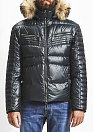 Модный, короткий пуховик черного цвета с зеленым отливом, премиального качества, с отделкой из натуральной кожи.
