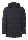 Стеганый пуховик средней длины с капюшоном. Длина по спинке в размере 50: 83,5 см. Цвет: темно-синий. Застежка на металлическую молнию с двумя бегунками. Планка, позволяющая застегивать кнопки без давления на тело. Воротник-стойка. Съемный капюшон на кнопках, планка убирается в воротник, пата регулирует глубину капюшона, кулиска регулирует объем по краю. 2 внешних кармана на магнитах. 3 внутренних кармана, 2 из них на молниях. Ткань верха защищает от ветра, влаги и холода. Благодаря особым свойствам структуры волокон, способным отводить влагу - между пуховиком и телом поддерживается сухой и теплый микроклимат. Подкладка из износостойкой ткани. Утеплитель: экопух - инновационный  материал, обладающий высокой теплоемкостью.