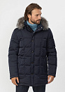 Удлиненный стеганый зимний пуховик темно-синего цвета. Длина по спинке в размере 50 - 83 см.