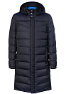 Удлиненный пуховик-пальто с капюшоном темно-синего цвета