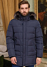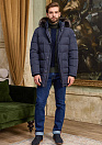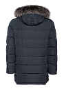 Удлиненный стеганый пуховик темно-синего цвета с капюшоном и меховой опушкой. Длина по спинке в размере 50: 86 см. Застежка на металлическую молнию с двумя бегунками и потайные кнопки. Планка, позволяющая застегивать кнопки без давления на тело. Воротник-стойка, внутренняя сторона воротника из мягкой микроворсовой ткани. Съемный капюшон на кнопках, планка убирается в воротник, пата регулирует глубину капюшона, кулиска регулирует объем по краю. Съемная меховая опушка на молнии и кнопках. Мех: сноуфрост. На рукаве расположен фирменный знак (вставка из алькантары с вышивкой). По низу спинки 2 шлицы на молниях. Рукава с отстегивающимися трикотажными манжетами на молниях. 2 внешних кармана на молнии. 2 внутренних на молниях. Ткань верха защищает от ветра, влаги и холода. Благодаря особым свойствам структуры волокон, способным отводить влагу - между пуховиком и телом поддерживается сухой и теплый микроклимат. Утеплитель: гусиные пух и перо (90/10%) с высоким показателем Fill Power (700-750), способен удерживать тепло при очень низких температурах. Подкладка дополнительно утеплена Valtherm®.