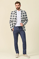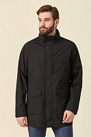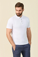 Состав лука: ветровка черная со скрытым капюшоном в воротнике; поло белого цвета из смеси льна и хлопка; брюки серо-синие из шерсти в спортивном стиле; рюкзак из зернистой кожи черного цвета.