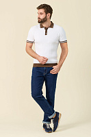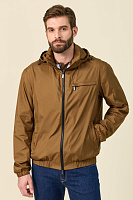 Состав лука: ветровка с капюшоном песочно-коричневого цвета; поло белого цвета из хлопка Пима; джинсы классического кроя средней ширины.