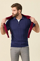 Состав лука: лонгслив бордового цвета из хлопка Пима; поло из хлопка, шелка и льна темно-синее; базовая футболка белая; брюки из тонкой шерсти коричневые в клетку.